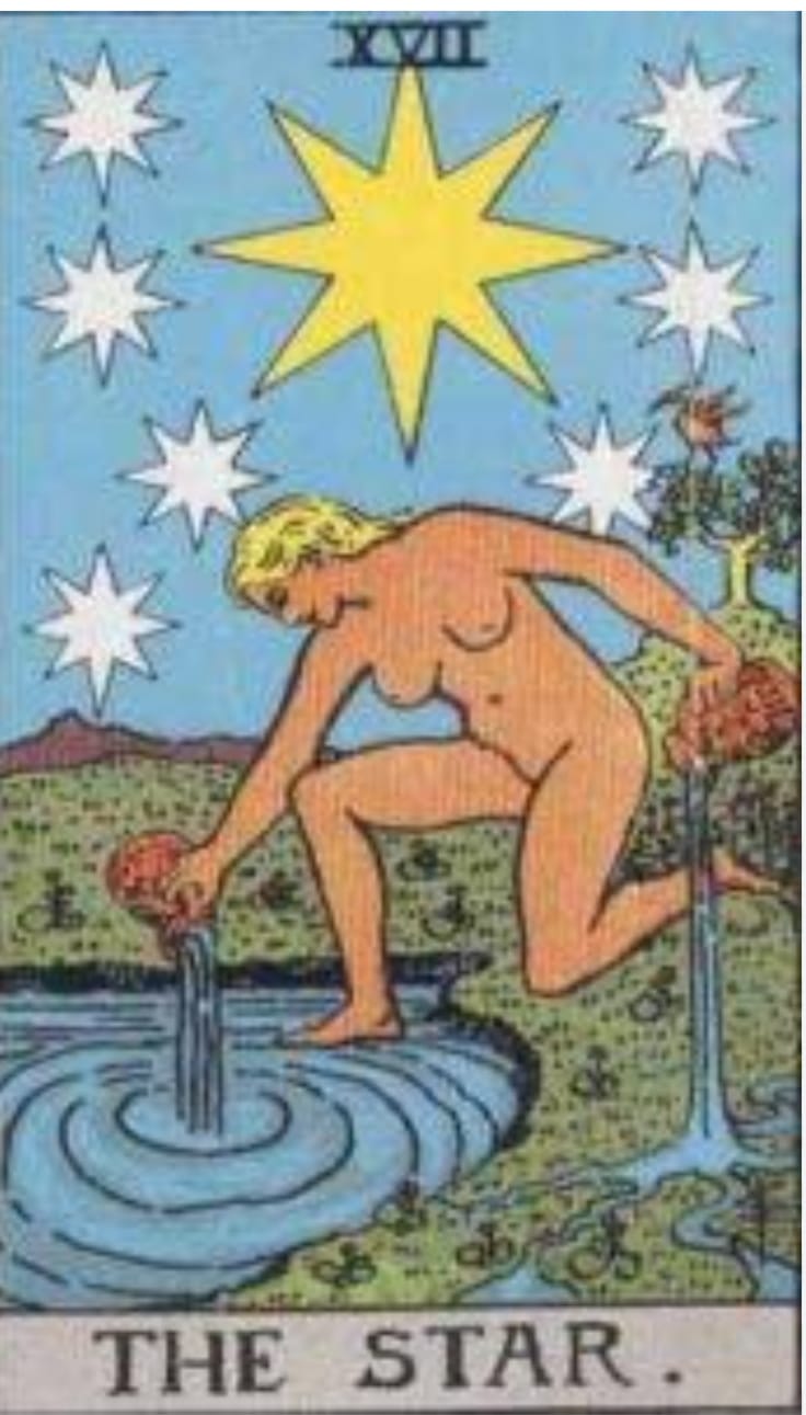 THE STAR कार्ड में एक महिलाअपने प्राकृतिक रूप में दिखाई दे रही है और उनका एक पर पानी में और दूसरा पैर जमीन में है उनके एक हाथ में एक पानी का बर्तन है जिससे वह सामने उपस्थित जल /तालाब से पानीउठा रही है और दूसरे पानी के बर्तन से वह पानी नीचे जमीन पर डाल रही है और वह यह पानी निकलता हुआ इस जल में प्रवेश कर रहा है यह जल की निकलती हुई पांच धाराएं हमारे पांच Senses को प्रदर्शित करती हैं